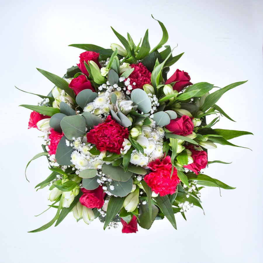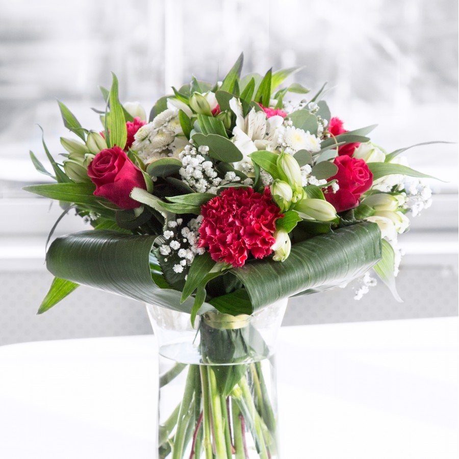 Our Radiant Grace Bouquet embodies sophistication and charm. This stunning arrangement features vibrant red roses and sweet white chrysanthemums, complemented by delicate gypsophila and elegant carnations. Enhanced with pristine white alstroemeria and lush aspidistra leaves, every flower is hand-selected to guarantee exceptional freshness and quality.