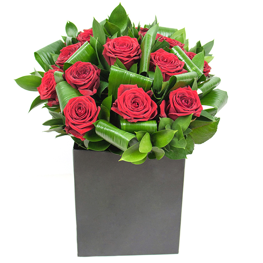 Brighten your home with our Radiant Red Rose Display. This stunning bouquet blends luscious red roses with vibrant aspidistra leaves and graceful ruscus, offering a unique and elegant floral arrangement.